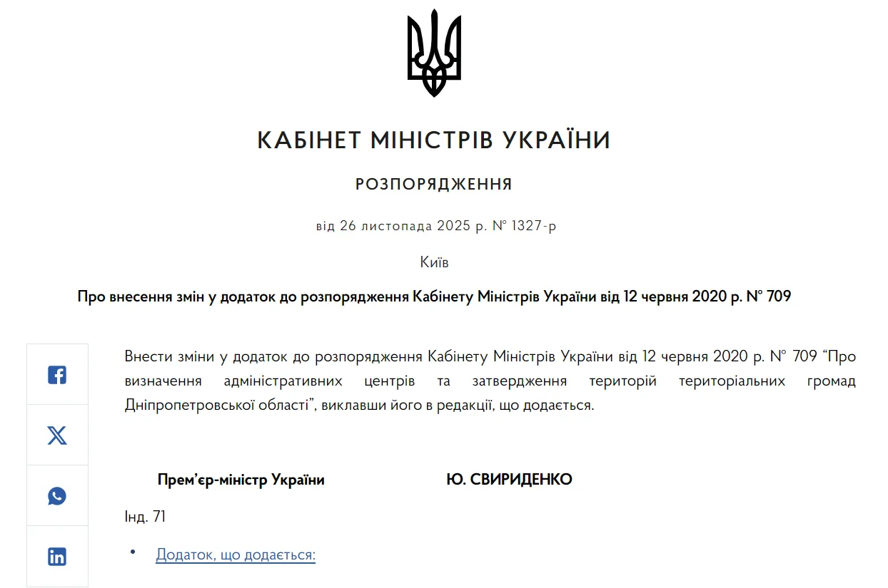 Відповідне розпорядження №1327-р Кабінет Міністрів України ухвалив 26 листопада 2025 року. Ця зміна є частиною процесу деколонізації та оновлення адміністративно-територіальної топоніміки, що передбачає приведення назв громад у відповідність до назв їхніх адміністративних центрів.